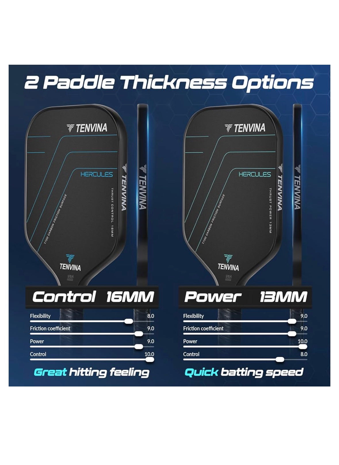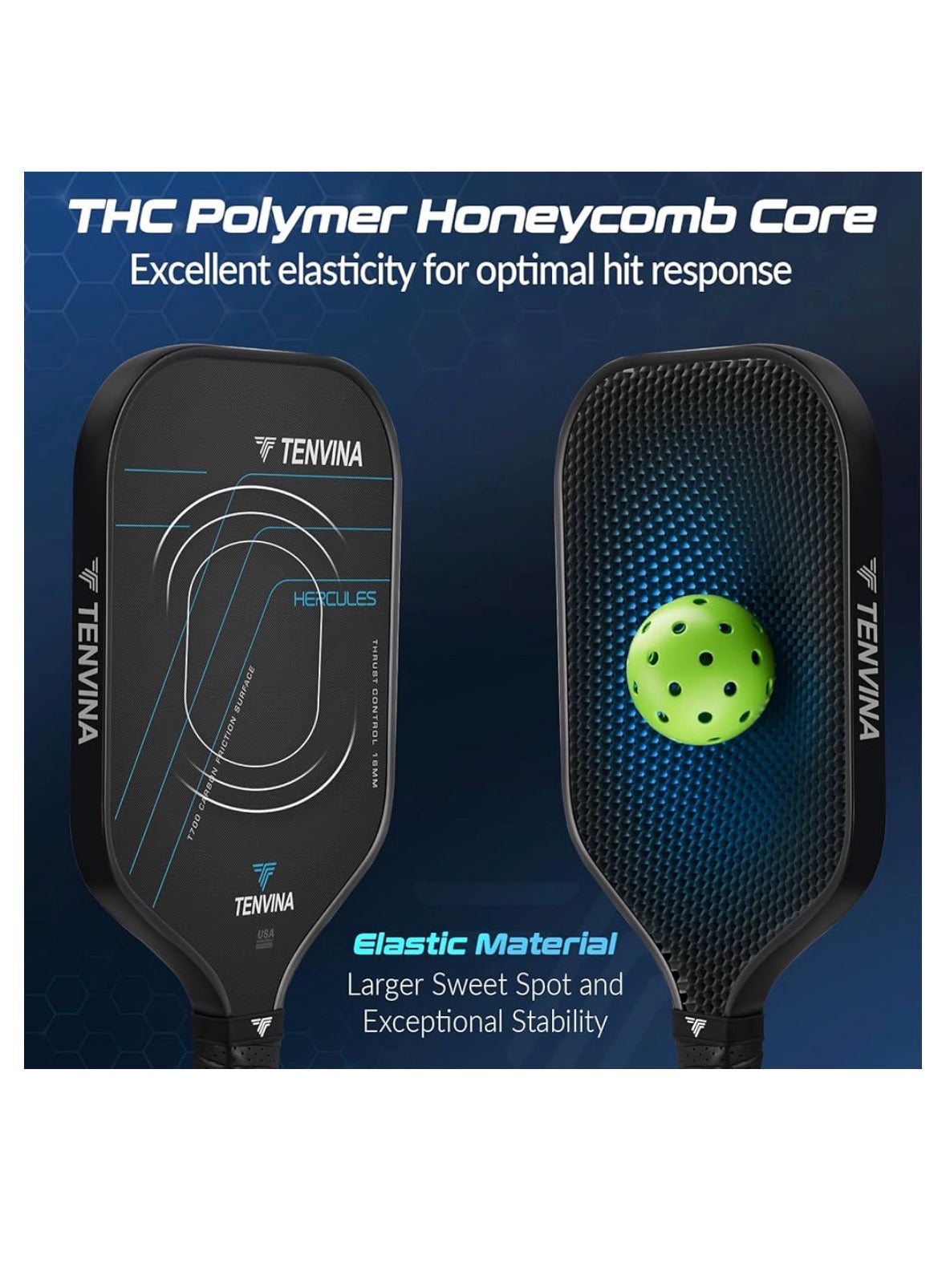 Accuracy and Spin: The TENVINA Pickleball Paddle features a THC polymer honeycomb core, designed to enhance performance with increased elasticity. This structure provides a larger sweet spot, delivering improved stability and control, which allows for more spin during play. This paddle is engineered to optimize your game strategy effectively.