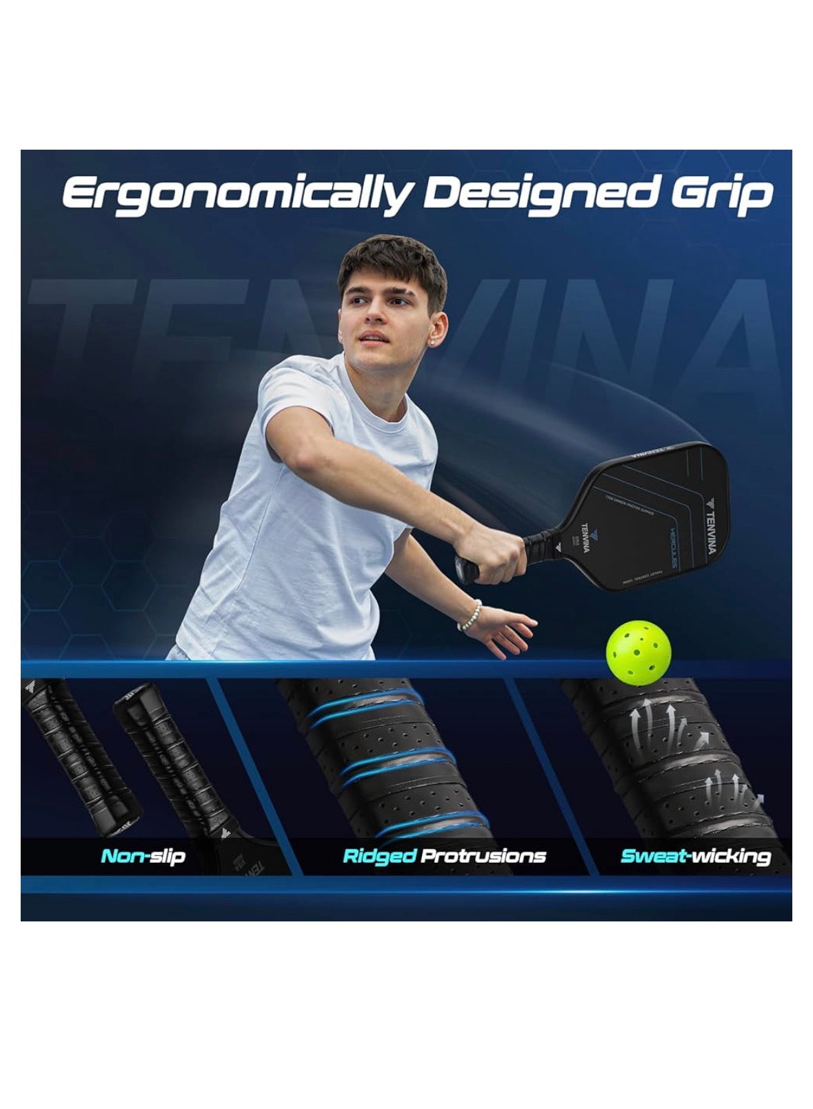 Comfortable handle: Our TENIVA Pickleball Paddle features an elongated handle that enhances grip comfort for various hand sizes. Its rubber surface provides improved traction, reducing slippage and ensuring precise control during gameplay. This ergonomic design supports extended play sessions while maintaining performance, making it suitable for both casual and competitive players.